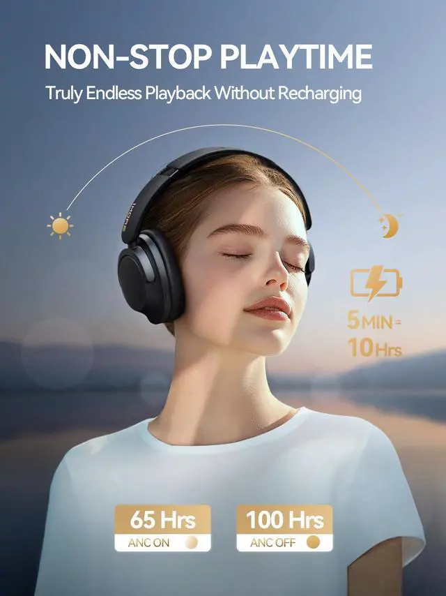 Long-Lasting Wireless Headphones: Enjoy 100-hour Bluetooth headphones (65h with ANC) and get 10 extra hours from just 5 minutes of charging - ideal for all-day wireless headphones.
