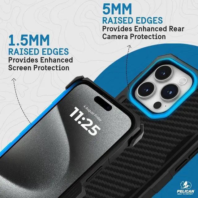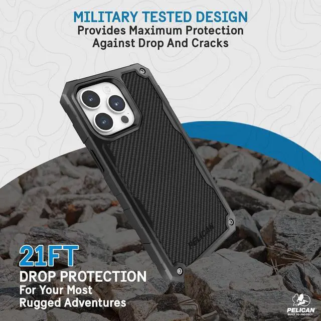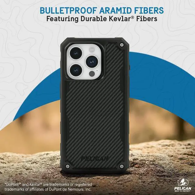 Shield Bulletproof Aramid Fibers Series: We build for the perfectionist who demands quality, both in equipment and experience, this pelican case designed for iPhone 15 Pro is made with multiple latches to lock and secure your phone, an easy-to-use holster included with a belt clip, and a kickstand for your next adventure; Anti-scratch coating ensures that your case looks newer for longer, while raised edges on both front and back protect the camera and screen