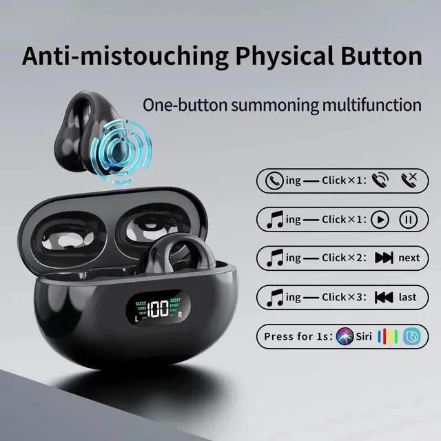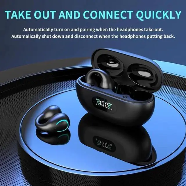 Open Ear Bone Conduction Headphones, Bluetooth Wireless Clip On Earbuds with Digital Display Charging Case 60 Hours Playtime IPX4 Waterproof Sports Headset for Running, Walking, Workout