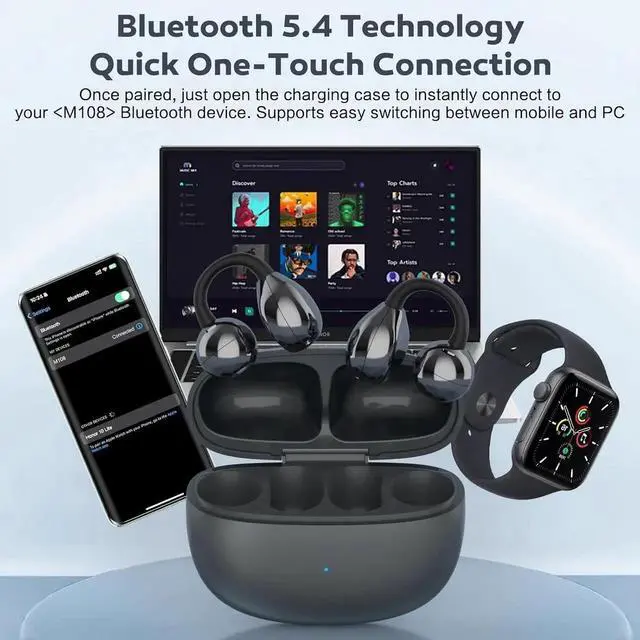 Durable Design with IP56 Waterproof Rating:The M108 earbuds wireless bluetooth are built for durability, featuring an IP56 waterproof rating that can handle sweat, rain, and splashes during intense workouts or outdoor activities. Whether you're cycling in the rain or working up a sweat in the gym, these bone conduction headphones are designed to withstand all elements. The open ear earbuds ensure that you never miss a beat while remaining comfortable and safe in any environment