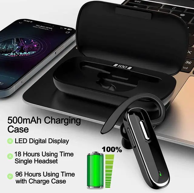 Battery Display Charging Case: Built with high quality lithium polymer battery, the Bluetooth headset for cell phones can provide you up to 18 hours high-fidelity music playing time and calls. Equipped with the 500mAh charging case to juice up the Bluetooth headset for almost 96 hours of music/talking time.