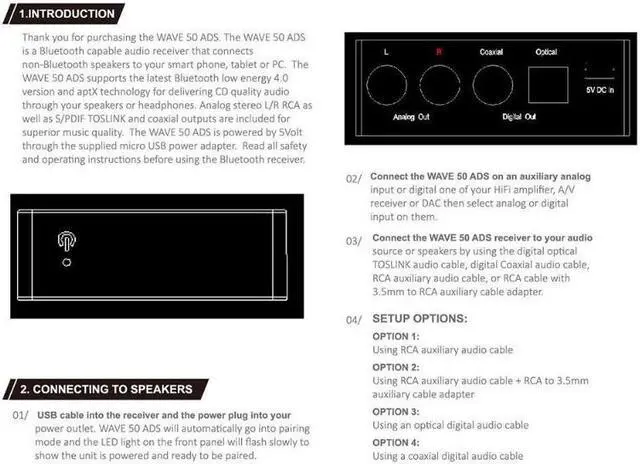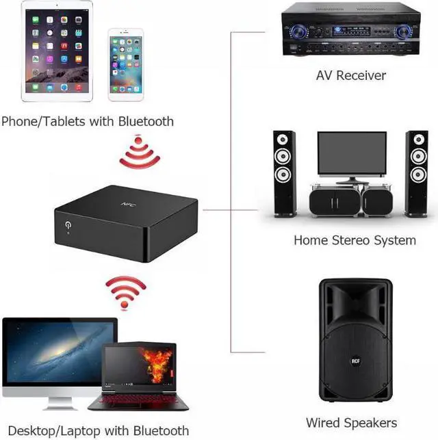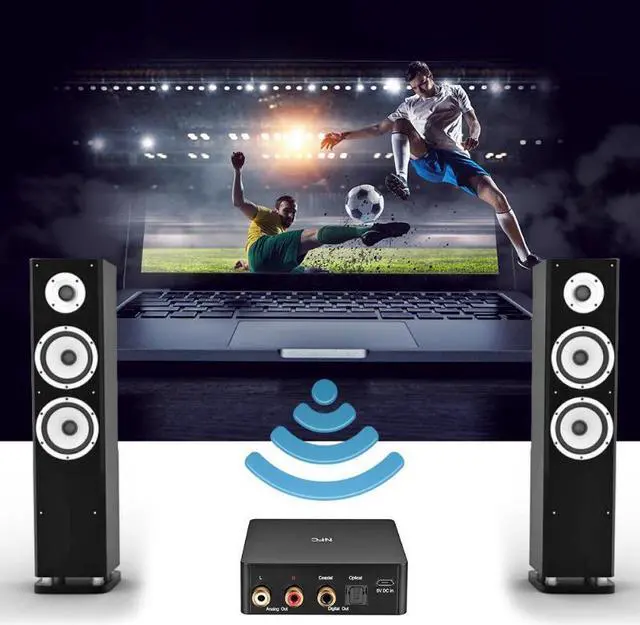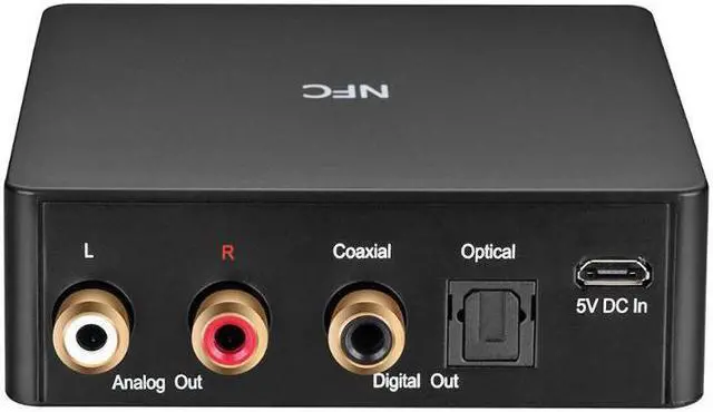 Feature:1. Bluetooth 4.0 connects BLE with lower power consumption.2. NFC quick connection.3. AptX advanced audio codec: CD sound quality.4. Analog output: stereo left / right RCA.5. Digital SPDIF output: TOSLINK optical fiber and coaxial.6. Support automatic reconnection.7. Enable link loss and reconnect.8. Low latency fast streaming transmission.9. Desktop version: plug and play.10. Micro USB power port.11. Plug and play without built-in batteries. Specification:Bluetooth version: Bluetooth 4.0Compatibility mode: EDR, A2DP and AVRCPNFC: NFC fast connectionInput: Bluetooth, support automatic connection.Output: stereo analog RCA; digital optical fiber (SPDIF) / coaxial (Coaxial).Power: Micro USB 5V, 200mAEffective distance: 30 metersMaximum output level: 2.0V RMSOutput impedance: 75 ohmsDecoder chip: TI PCM5102ASignal-to-noise ratio: > 112dB (DC to 20kHz)Distortion + noise: <0.02% (1 kHz FS 96 KS/s)Frequency response range: 10Hz-20kHz (+/-0.5dB)Input bit depth: 32bit (oversampling)APTX low latency: 30 ms Note: Please allow 1-3mm differs due to manual measurement.Due to the different display and different light, the picture may not show the actual color of the item. Thanks for your understanding.