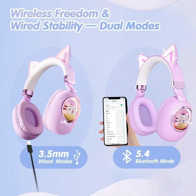 esonstyle Cat Ear Headphones for Kids - Bluetooth 5.4 On-Ear Noise Cancelling Headphones with Microphone 85dB Safe Volume Limit Wireless or 3.5 mm Wired Mode USB C for School Learning Travel (Purple)