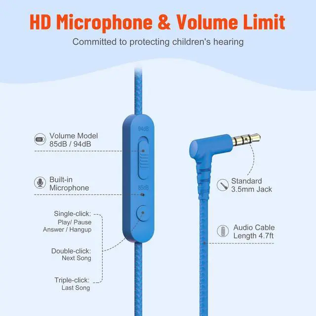 [ 85/94dB Safe Volume Limiting ] : Specially design to protect your childrens hearing, this kids headphones can be limited to the sound level of 85dB in peaceful environment as home/room/study, and also limited to the sound level of 94dB in different noise environments as airplane/car/school, the sound are still safe and clear.