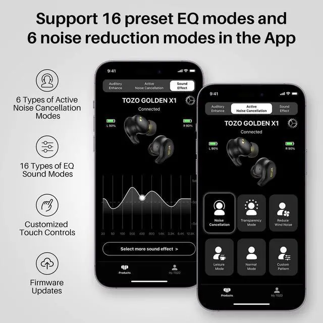 [Support TOZO APP & 16 Preset EQ Modes] Fast and convenient access to the EQ mode switch provided by TOZO APP, which can save the function of noise reduction intensity customized adjustment and EQ curve settings. Also TOZO Acoustic Lab's provides 16 preset EQ in TOZO APP, as well as the EQ option provides you with a customized sound setting, including Rock, Classical, Jazz, Hip-Pop, etc, which perfectly reflects different music styles.