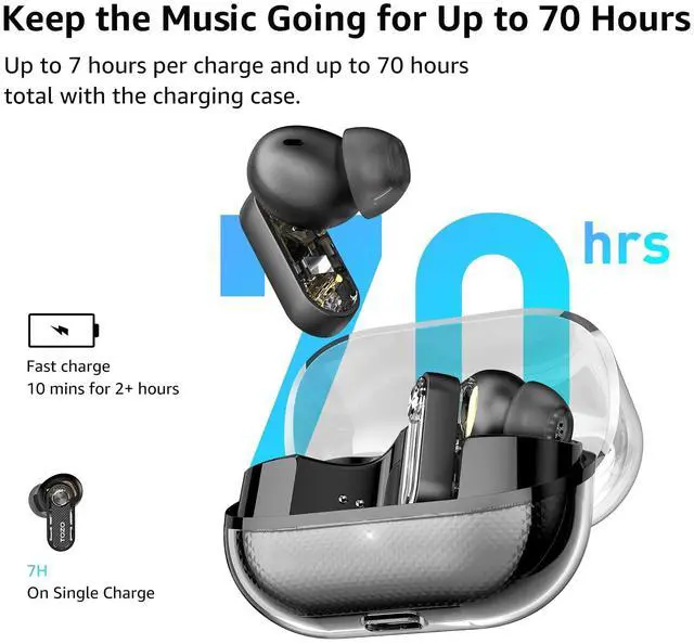 [Up to 70 Hours of Power for Your Week] Enjoy up to 7 hours per charge (ANC OFF), with the case providing 2.5 extra recharges for up to 70 hours total when alternating use. Thats enough for days of music, commuting, and calls. Even with ANC ON, get up to 60 hours total. Need a quick boost? A 10-minute charge delivers 2+ hours of listening.