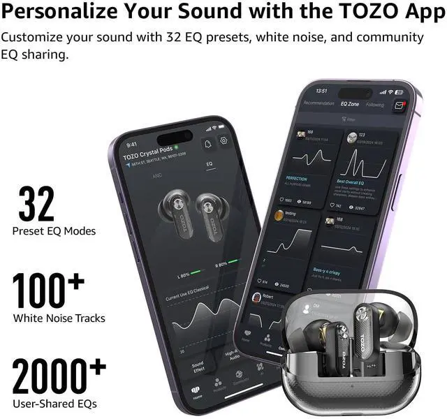 [Personalized Listening Experience] Use the TOZO app to customize the controls and choose from 32 EQ presets. You can also share the joy of custom equalizers with over 2,000 audiophiles from around the world in the EQ Zone.