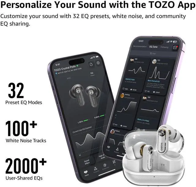 Personalized Listening Experience, Use the TOZO app to customize the controls and choose from 32 EQ presets.