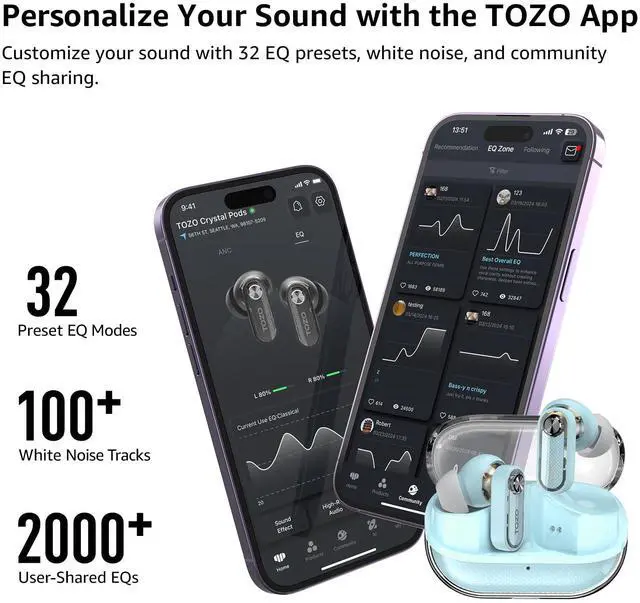 Personalized Listening Experience, Use the TOZO app to customize the controls and choose from 32 EQ presets.