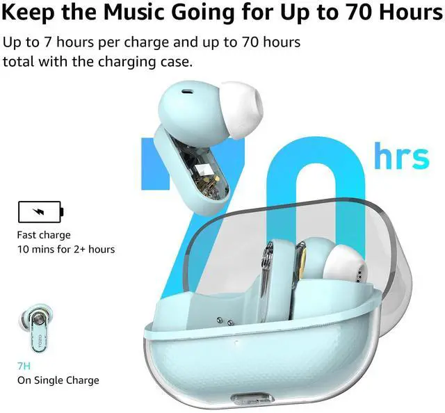 [Up to 70 Hours of Power for Your Week] Enjoy up to 7 hours per charge (ANC OFF), with the case providing 2.5 extra recharges for up to 70 hours total when alternating use. Thats enough for days of music, commuting, and calls. Even with ANC ON, get up to 60 hours total. Need a quick boost? A 10-minute charge delivers 2+ hours of listening.