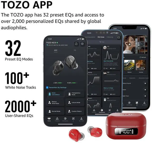 [32EQs Options & Exclusively Sharing Zone] Tailor the sound with the TOZO app further, which allows you to adjust bass levels, music style, and noise cancellation modes to your liking, and experience the joy of sharing your customized EQ with global audiophiles in 'EQ zone'.