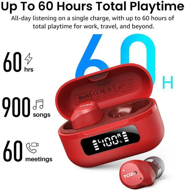 [Upgrade your Playtime with the NC9 2024] The charging case not only serves up to 59H (ANC off) and 42H (ANC on) totally playtime after 2 hrs fully charge, and 14hrs (ANC off) and 10hrs (ANC on) playback for single use. It also displays the remain battery, ensuring it's still there when you need it most.