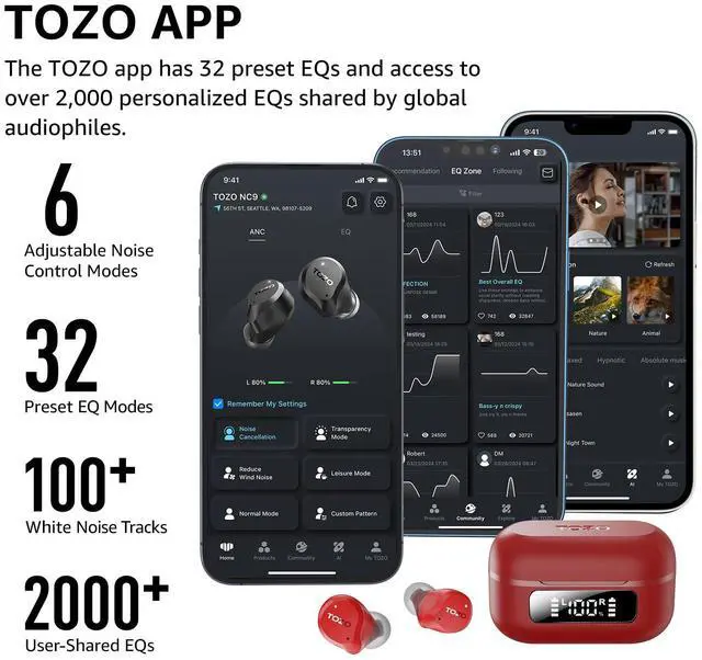 [32EQs Options & Exclusively Sharing Zone] Tailor the sound with the TOZO app further, which allows you to adjust bass levels, music style, and noise cancellation modes to your liking, and experience the joy of sharing your customized EQ with global audiophiles in 'EQ zone'.
