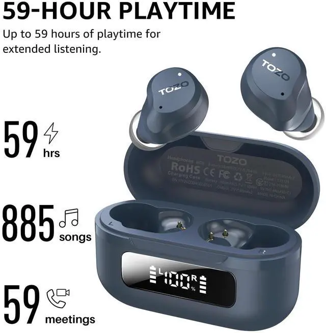 [Upgrade your Playtime with the NC9 2024] The charging case not only serves up to 59H (ANC off) and 42H (ANC on) totally playtime after 2 hrs fully charge, and 14hrs (ANC off) and 10hrs (ANC on) playback for single use. It also displays the remain battery, ensuring it's still there when you need it most.