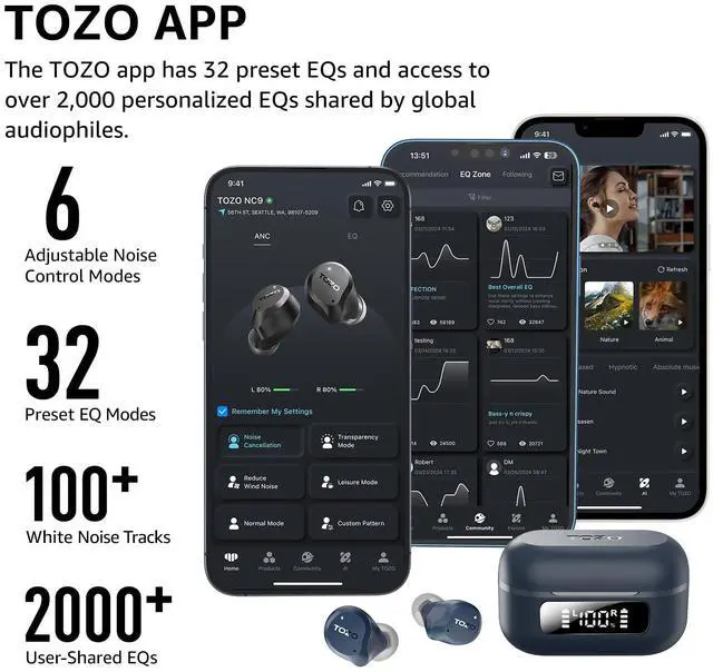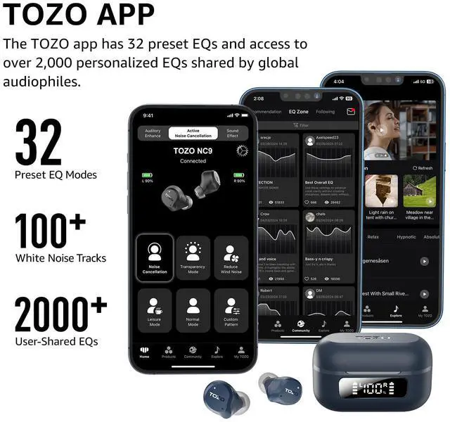 [32EQs Options & Exclusively Sharing Zone] Tailor the sound with the TOZO app further, which allows you to adjust bass levels, music style, and noise cancellation modes to your liking, and experience the joy of sharing your customized EQ with global audiophiles in 'EQ zone'.