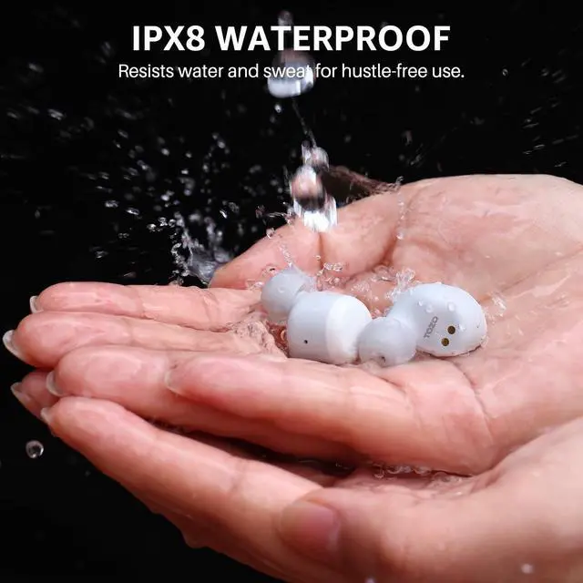 [IPX8 Waterproof] Earbuds and charging case inner Nano-coating make it possible to waterproof for 1 meter deep for 30 minutes. It is suitable for sports to prevent water. Ideal for sweating it out at the gym. Earbuds and cases even can be washed by water and soap.