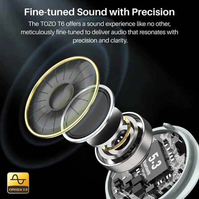 [Bluetooth 5.3 ] Adopt the advanced Bluetooth 5.3 technology. TOZO T6 supports HSP, HFP, A2DP, and AVRCP, which greatly improve the transmission speed and provide you with a low-latency listening experience.