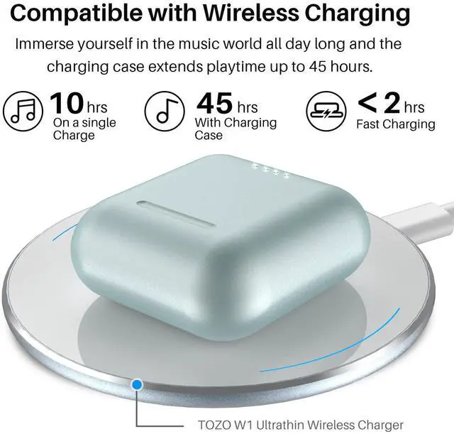 [Charge on the Go] Playtime lasts for over 10 hours from a single charge and total 45 hours with a charging case. Enjoy fast charging, to fully charge the rechargeable case only 55 minutes via cable or less than 2 hours via wireless charger. Providing a convenient charging way with no strings attached.