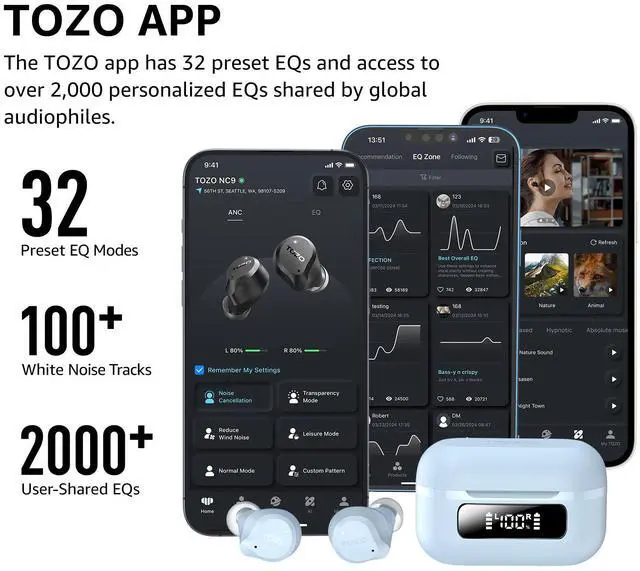[32EQs Options & Exclusively Sharing Zone] Tailor the sound with the TOZO app further, which allows you to adjust bass levels, music style, and noise cancellation modes to your liking, and experience the joy of sharing your customized EQ with global audiophiles in 'EQ zone'.