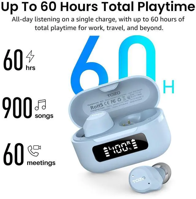 [Upgrade your Playtime with the NC9 2024] The charging case not only serves up to 59H (ANC off) and 42H (ANC on) totally playtime after 2 hrs fully charge, and 14hrs (ANC off) and 10hrs (ANC on) playback for single use. It also displays the remain battery, ensuring it's still there when you need it most.