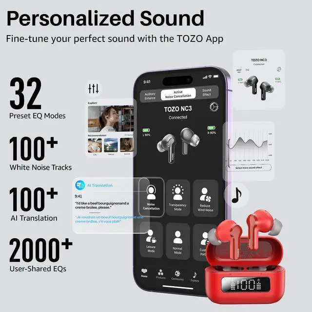 [32 Preset Modes with TOZO App] Use the TOZO app to choose between 32 EQ settings, which allows you to personalize your sound profile or switch your favorite music style, and experience the joy of sharing your customized EQ with audiophiles around the world in the 'EQ zone'.