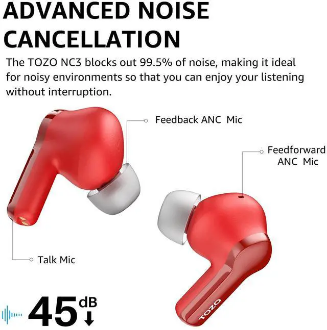 [Hybrid Active Noise Cancellation] TOZO NC3 Bluetooth earbuds are equipped with hybrid active noise cancellation technology with a noise reduction depth of up to 45dB. So whether you're on the subway or a noisy street, you'll always enjoy your music or calls without any distractions.