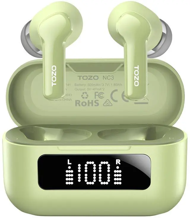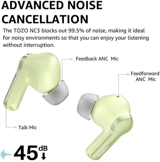 [Hybrid Active Noise Cancellation] TOZO NC3 Bluetooth earbuds are equipped with hybrid active noise cancellation technology with a noise reduction depth of up to 45dB. So whether you're on the subway or a noisy street, you'll always enjoy your music or calls without any distractions.
