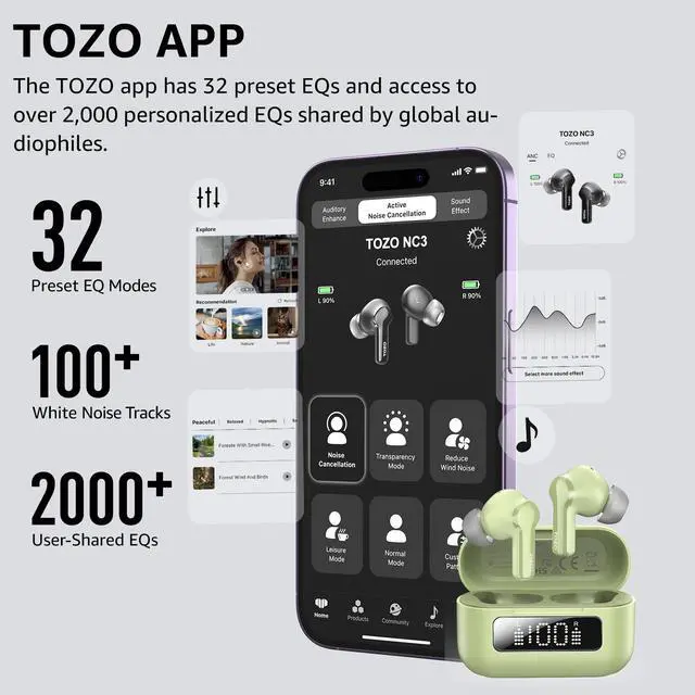 [32 Preset Modes with TOZO App] Use the TOZO app to choose between 32 EQ settings, which allows you to personalize your sound profile or switch your favorite music style, and experience the joy of sharing your customized EQ with audiophiles around the world in the 'EQ zone'.