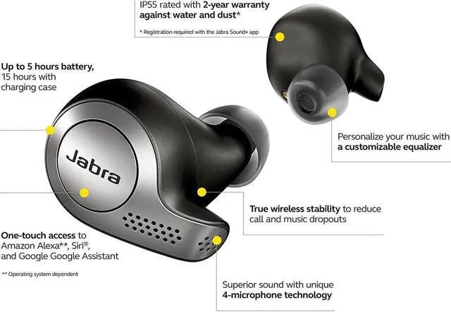 Experience the stability that lets you take calls and listen to music without worrying about audio dropouts Up to 5 hours of battery, and with additional power from the included pocket-friendly charging case, you can enjoy up to 15 hours of use making sure your listening needs are met all day long IP55 rated and comes with a 2-year warranty against damage from water and dust (registration required with the Jabra Sound+ app)