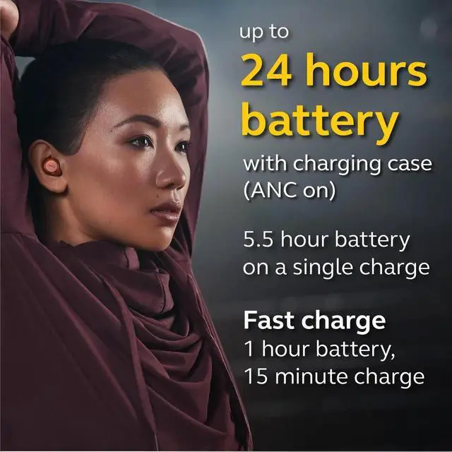 Enjoy up to 5.5 hours of continuous use, or up to 24 hours with the charging case (ANC on). If you use them without ANC, youll get even more juice, with up to a total of 28 hours in the case. Speaking of the case, its extremely compact, with powerful magnets that lock the earbuds into place, USB-C charging, including fast charge, and a handy upright design.