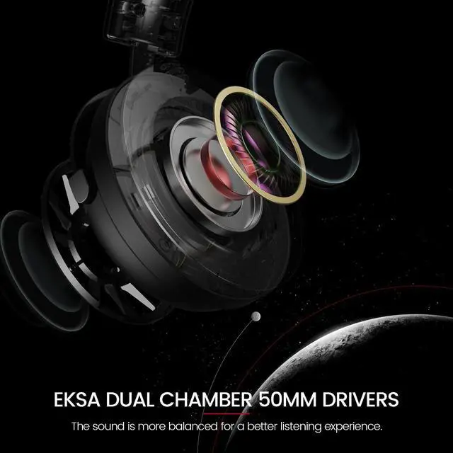 Cutting-Edge Audio Innovation- The EKSA StarEngine S gaming headphones showcase an advanced EKSA Dual Chamber Drivers symmetrical acoustic architecture, effectively mitigating sound positioning discrepancies stemming from the left and right headset shape disparities, ensuring precision in audio placement. The high-fidelity 50mm drivers deliver rich, detailed, and well-layered sound, ensuring an unmatched gaming experience.