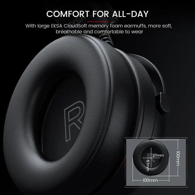 Unmatched Comfort- Our headset with microphone is designed for ultimate comfort. It features lightweight materials and an adjustable headband that reduces pressure on your head, ensuring a cozy experience during long gaming sessions. EKSA's CloudSoft Ear Cushions fit snugly around your ears, providing excellent sound isolation without discomfort. This combination of low pressure design and scientific acoustics guarantees a superbly comfortable fit.