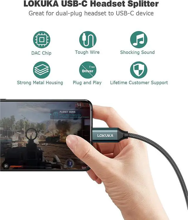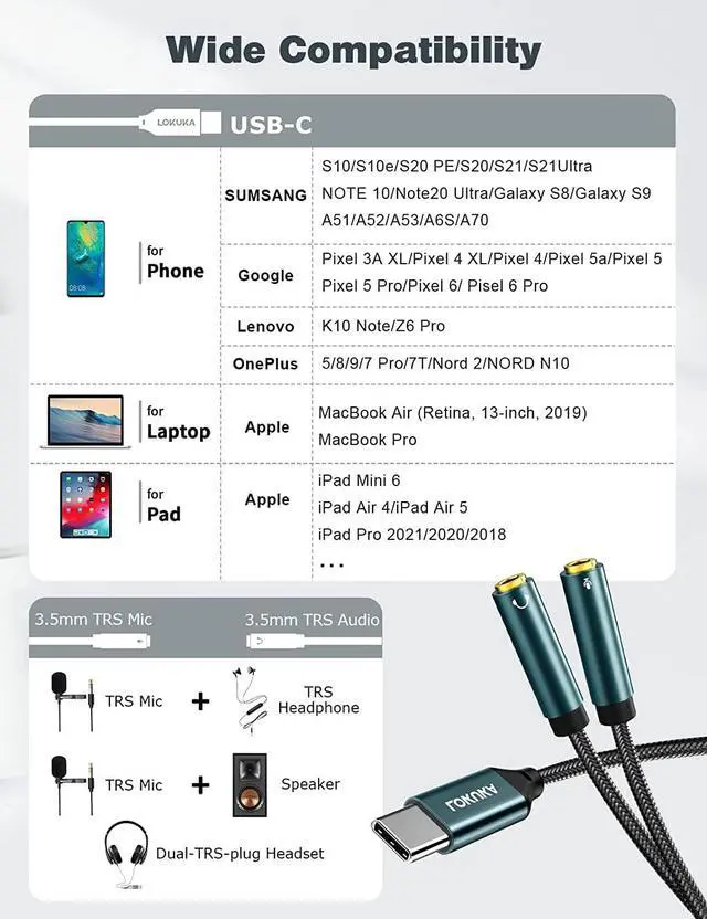Eg: transfer a clearer and louder voice in an online class track footsteps and move ahead of other players with great accuracy in your game. Advanced MaterialsThe jade green metal housing is a matte metal surface elegant design anti-scratch no fingerprints and dissipates heat quickly. USB C plug is very tight and not easy to loosen passed 10000+ swing testing. Gold-plated 3.5 mm prevents rust stabilizes audio transmission and improves the response speed. LOKUKA's exclusive crystal nylon braid is anti-tensile anti-dirty Smooth and tangle-free it's a soft cover but also an armor for long-term use.?? NOTICE (1) This type-c headphone adapter works for a dual-TRS-plug headset NOT for two sets of mics or headphones. (2) When using the mic both the headphone cable plug and mic plug should be TRS TRS cable plug has 2 black rings. NOT Compatible with TRRS mics. (3) If your USB-C device has a 3.5 mm audio port it won't work. (4) Our sound range is wide and the volume may be loud in order to protect your ears please turn down the volume before playing.?? 24/7 Customer Support 24-hour free online Q&A 30-Day unconditional refund or replacement 12-Month unconditional warranty (you can also extend it for free if you need it) and lifetime technical support will solve any issues for you.