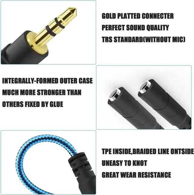 Stereo Splitter Cable: Dual Headphone Jack Adapter delivers undiminished stereo sound to both 3.5 mm female jacks. With the combination of gold-plated connector bare copper conductors and 3-layer solid shielding (including enameled copper tinned copper and TPE jacket) the 3.5 mm Audio Splitter provides superior performance and offers high-fidelity ultra-clear and noise-free stereo audio.