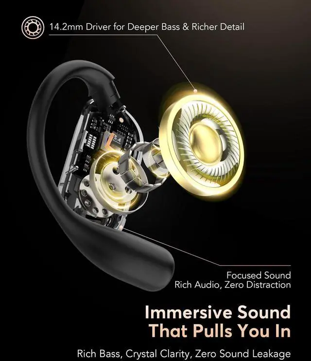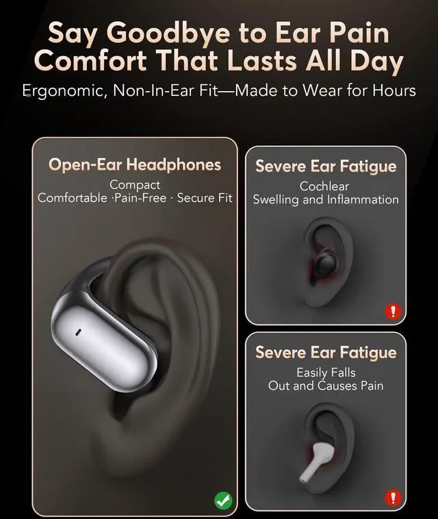 OPEN-EAR COMFORT WITH IMMERSIVE SOUND -- Enjoy crystal-clear, immersive audio while staying aware of your surroundings. These open ear headphones wireless bluetooth feature an ergonomic open-ear design that fits naturally around your ears without pressure or pain. Perfect for working, commuting, or workouts, they deliver stable, non-intrusive wear for all-day comfort.