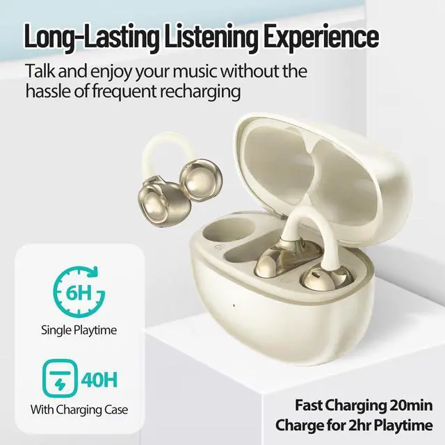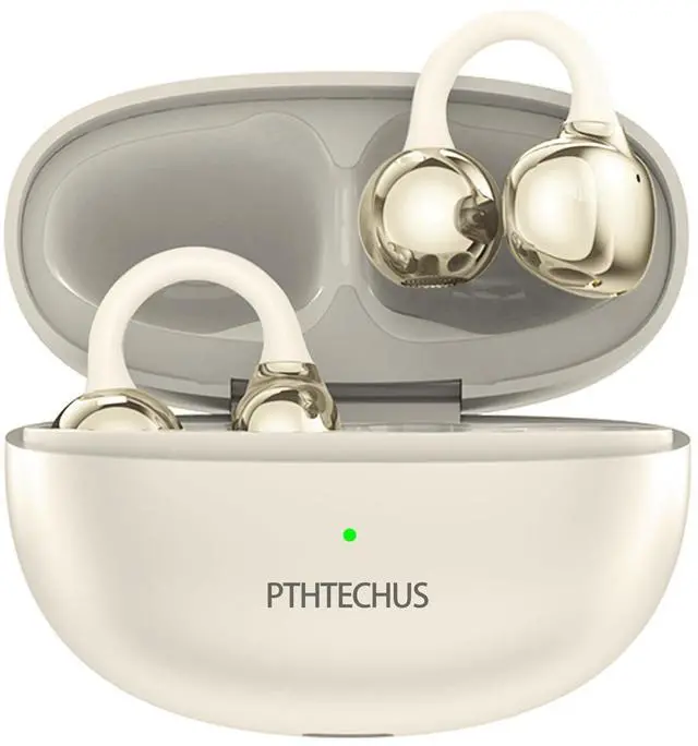 PTHTECHUS Open Ear Clip Headphones, Bluetooth 5.4 with ENC Audio Wireless Earbuds, 40 Hours Playback, Noise Cancelling Calls, Stable Fit Wireless Open Earphones Compatible with iPhone, Android (White)