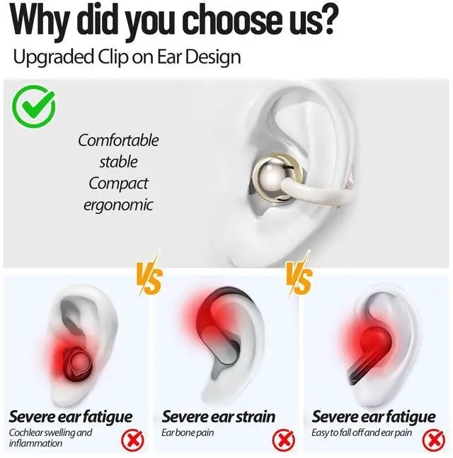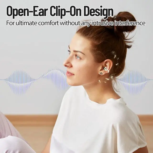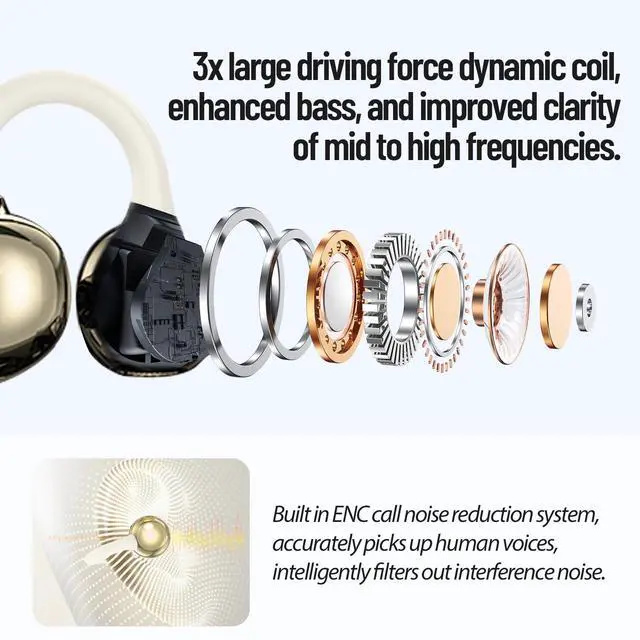 [(Open Headphones)] The wireless headphones are designed with a completely open design, and the earbuds can be worn gently and firmly above the auricle. Open headphones are usually lighter and more breathable than in-ear headphones, and are more comfortable even for long-term wear, saying goodbye to ear pain, and fit perfectly with glasses and other accessories. It is ideal for sports, driving or working.