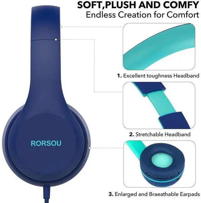 RORSOU K5 Kids Headphones with Microphone for shchool, Volume Limiter 85/94dB, Foldable Stereo Tangle-Free 3.5 mm Jack Wired Cord On-Ear Headphones for Children/Boys/Girls/Kindle/Tablet/MP3/4 (Blue)
