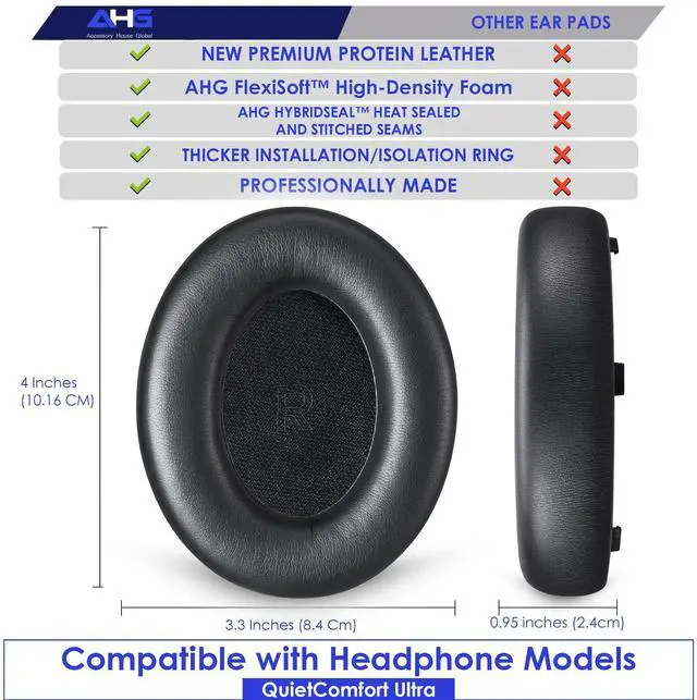 Crisp and Clear Sound - That's exactly what you expect from your QuietComfort Ultra Wireless headphones, and this new AHG Accessory House Global kit delivers. Made with premium protein leather and FlexiSoft high-density foam, they offer unmatched comfort for every listening session. But the real magic lies in the sound--these ear pads are designed to preserve the audio quality you love. Enhanced with a thicker installation ring, they ensure a tighter fit and exceptional noise isolation, so you can enjoy your music without compromise.