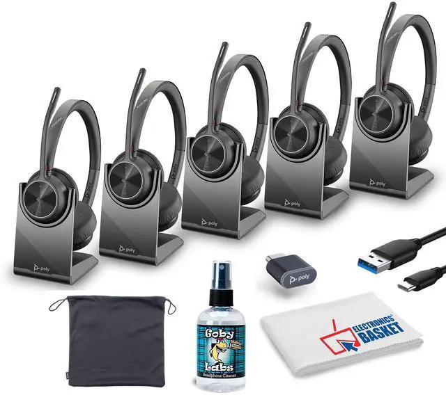 5x Poly Voyager 4320 UC Bluetooth Headset with Charging Stand (Microsoft Teams Certified) with Travel Pouch