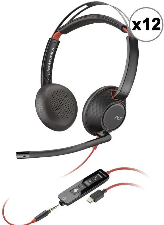 - 12x Poly Blackwire 5220 Stereo Wired Headset Dual Ear USB-A/USB-C & 3.5mm with Noise-Canceling Boom Mic, Inline Controls, All-Day Comfort, and Carrying Case