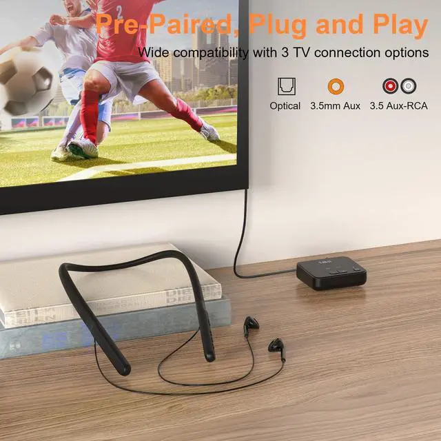 Select one of 3.5mm AUX, Optical, and AUX to RCA audio cable that fits your TV output, and turn on the wireless headphones to automatically connect.