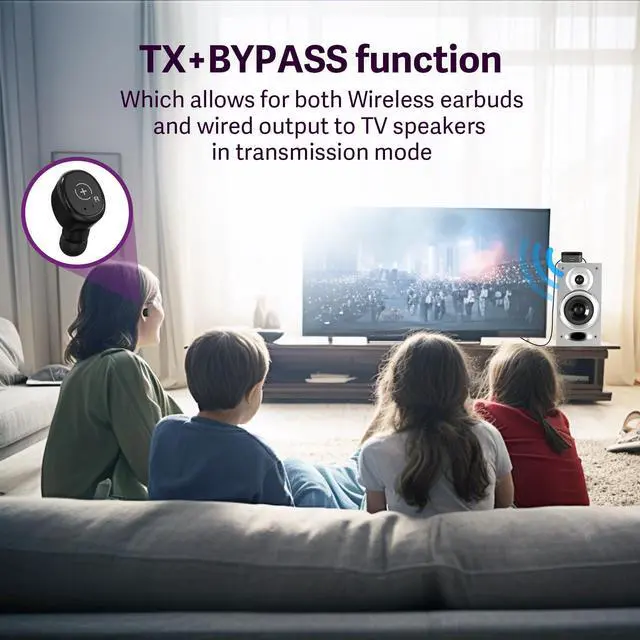 - This device supports both wireless and wired use at the same time, after connecting the TV to the transmitter, you can continue to choose optical or AUX/RCA 3.5mm cable to connect the transmitter audio output to the stereo audio input.