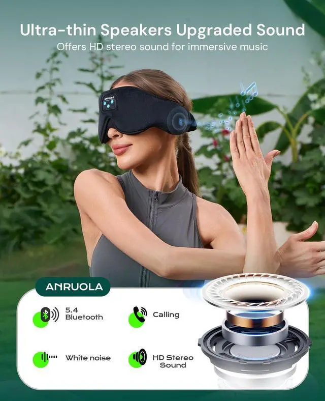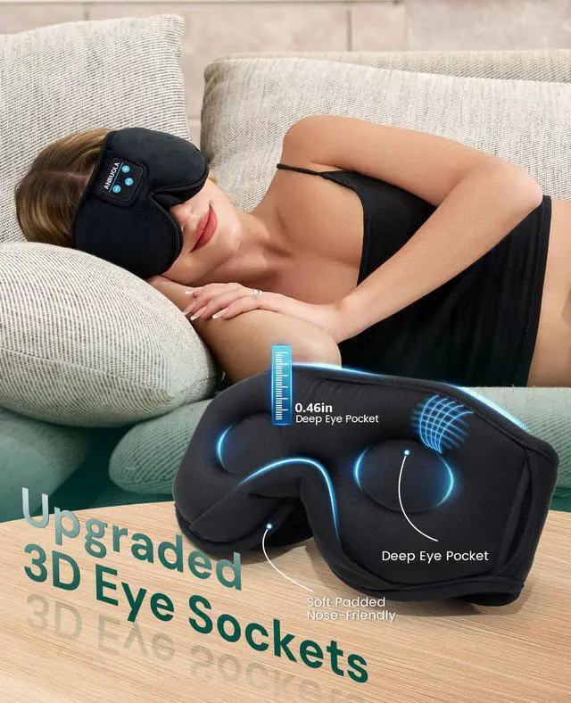 3D Bluetooth Sleep Eye Mask, Perfect Combination of Headphones and Eye MaskBluetooth sleep eye mask adopts innovative 3D design, combining high-quality wireless headphones and comfortable sleep eye mask, specially designed for side sleepers. The eye mask effectively blocks light, and the headphones provide clear music, perfectly enhancing the sleeping experience.Ideal for relaxing occasions such as lunch breaks, meditation, travel or long-distance flights, allowing you to enjoy deep sleep without interference.