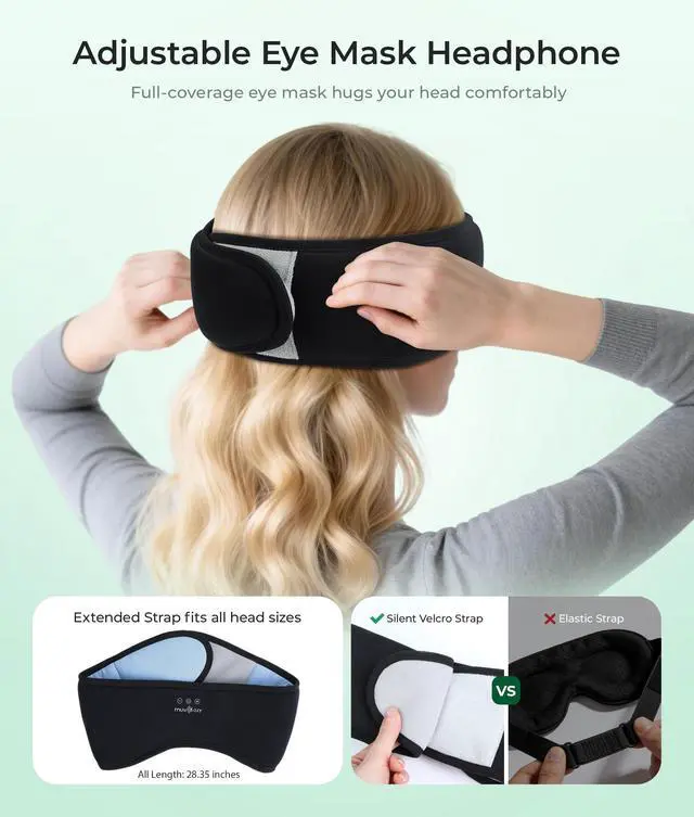 • Full Coverage Sleep Mask - Sleep headphones for side sleepers with extended design and adjustable Silent Velcro ensures a complete and customizable fit for all head sizes. Easily adjust it to block out 100% of light, creating your personal darkness sanctuary for deeper sleep. No more light leaks, no more slipping off during the night.