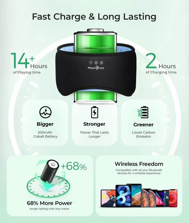• 14+Hour Playtime & 2-Hour Charge - Say goodbye to battery anxiety with MUSICOZY Sleep Headphones Headband! The powerful battery offers up to 14+ hours of enjoying playtime after 2 hours charging, lasting through multiple trips without frequent charging.