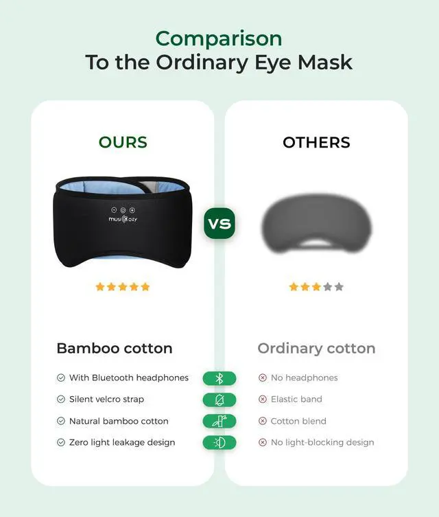 • Total Blackout & Skin-Friendly Feel - MUSICOZY sleeping mask designed with breathable bamboo cotton fabric material. The eye mask features a dedicated light-blocking design on the nose wings, gently contours to your face without pressure, providing a dark and friendly feel for both side and back sleepers, ensuring you wake up refreshed without any marks or irritation.