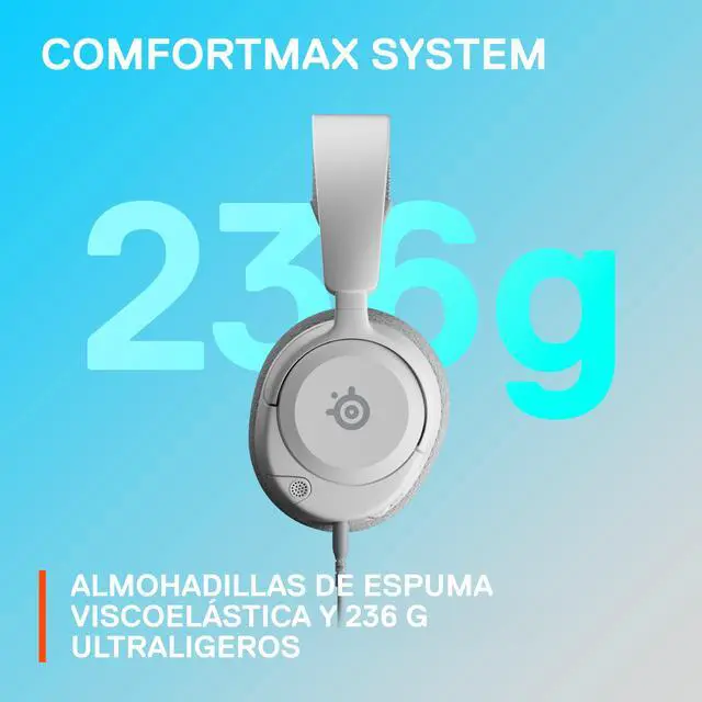 Drip check. The Arctis Nova 1P's stylish profile weighs just 236g/0.52lbs, ensuring comfortable wear all day long. Your ears stay cool with AirWeave Memory Foam cushions, keeping you comfy throughout your gaming session.