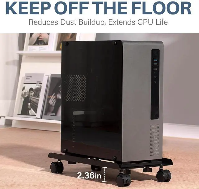 The mobile computer tower stand keeps the computer case off the floor, carpet or desktop. Free movement for easy cleaning