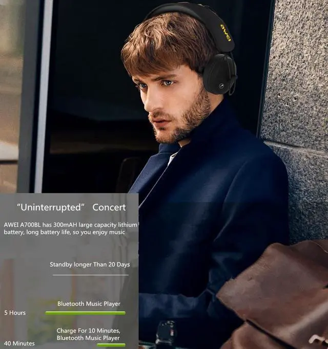 AWEI A800BL Bluetooth Headphones Headset Wireless Headphone Microphone Headset Sports For iOS Android stereo double channel Main Features: Bluetooth V3.0 HiFi music headphones, the transmission range up to 10m. Lightweight and fashion, three-dimensional keys design. Noise reduction technology. Pairing two phones at the same time. Built-in noise reduction mic, to provide clear music and calls. 500mAh Li-ion battery, 12 hours music time. Adjust head beam according to your size. Function: Answering Phone,Bluetooth,HiFi,Microphone,Noise Cancelling,Song Switching Connectivity : Wireless Application: Computer,DJ,For iPod,Mobile phone,Portable Media Player,Sport Driver unit: 40mm Sound channel: Two-channel (stereo) Frequency response: 2.1GHz - 2.18GHz Impedance: 9ohms Sensitivity: 100 3 dB Talk time: 4H Music Time: 5H Charging Time (h): 2H Bluetooth: Yes Bluetooth version: V3.0 Battery Capacity(mAh): 300 Package weight: 0.500 kg Package Contents: 1 x Headphones, 1 x Bag, 1 x USB Cable